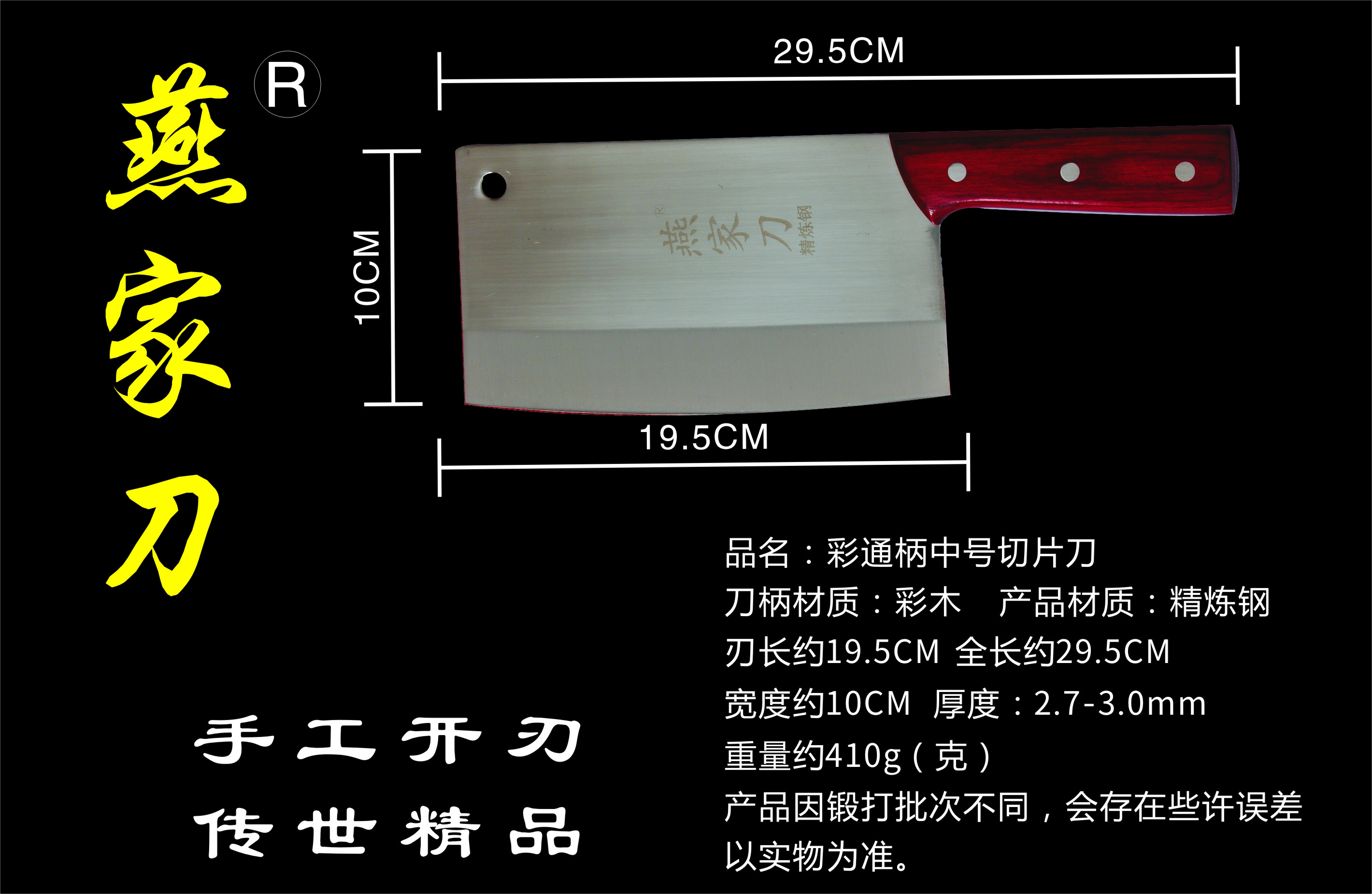 樂(lè)山燕家刀具有限公司(公司前身為燕佳鐵匠鋪),公司坐落于美麗的佛都之鄉(xiāng)樂(lè)山嘉州,在全國(guó)各地有上千家代理經(jīng)銷(xiāo)點(diǎn),公司專(zhuān)業(yè)銷(xiāo)售、設(shè)計(jì)、制作各類(lèi)刀具。秉承一貫鍛造三精要求,即選料精、用料精、工藝精。所選材料全部產(chǎn)自滇東鐵礦優(yōu)產(chǎn)區(qū)。本品牌刀具堅(jiān)持千挑萬(wàn)選為材,千錘百煉為刀的手工鍛造工藝宗旨。具有鋒利耐磨、持久耐用,用料上乘,硬度高、韌度強(qiáng)的特點(diǎn)!